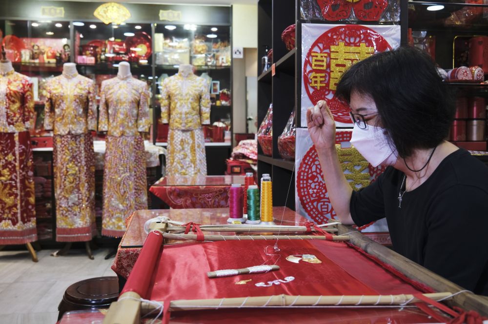 林卓怡说,为确保每一件裙褂的图案对称流畅,光泽持久,“刺绣必须由同一位师傅完成,且手上不能有汗,否则会让金银线氧化变色”。他们聘请的刺绣师傅都是从业几十年的老师傅,目前主要集中在江苏苏州。