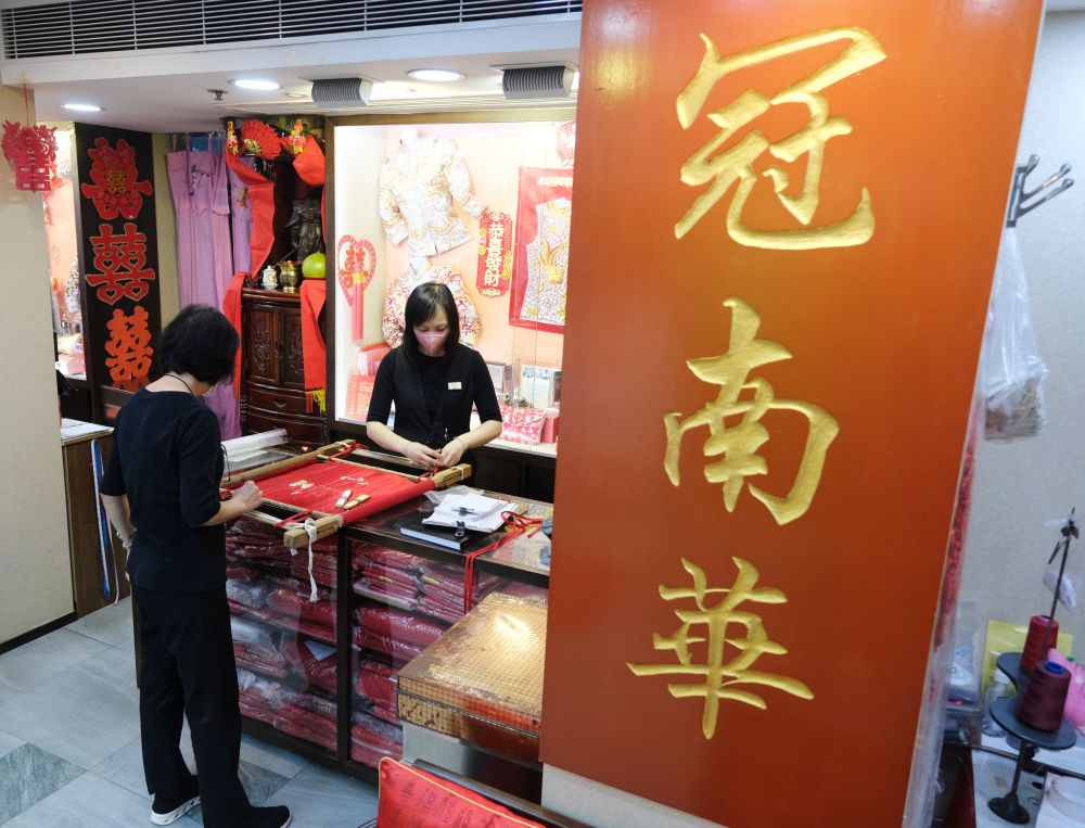 在香港,像这样坚持用传统手艺制作中式嫁衣的店铺如今不超过5家。岁月如潮,百年中式礼服老店冠南华,依然在用看似最“笨”的方式向传统致敬。