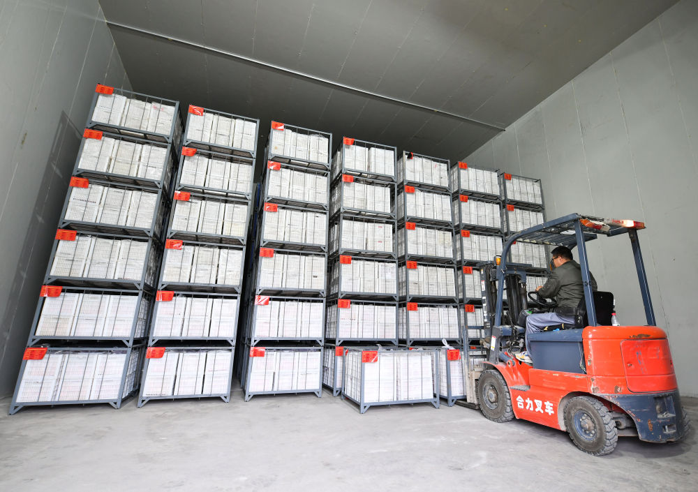 10月27日,在陕西延安市安塞区高桥镇南沟村,工作人员在冷库搬运苹果。新华社记者张博文/摄