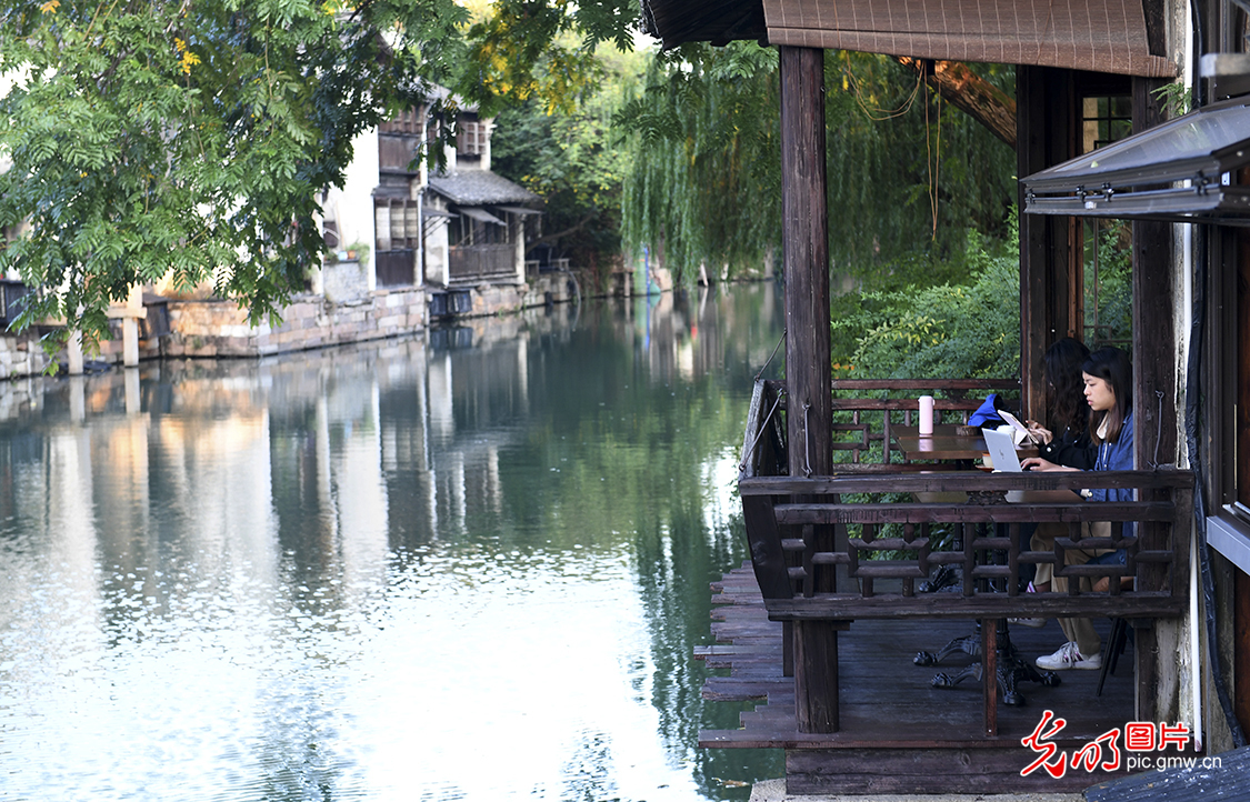 2022年11月6日,两名媒体记者在乌镇西栅景区一家咖啡厅工作。(光明网记者 潘迪摄/光明图片)