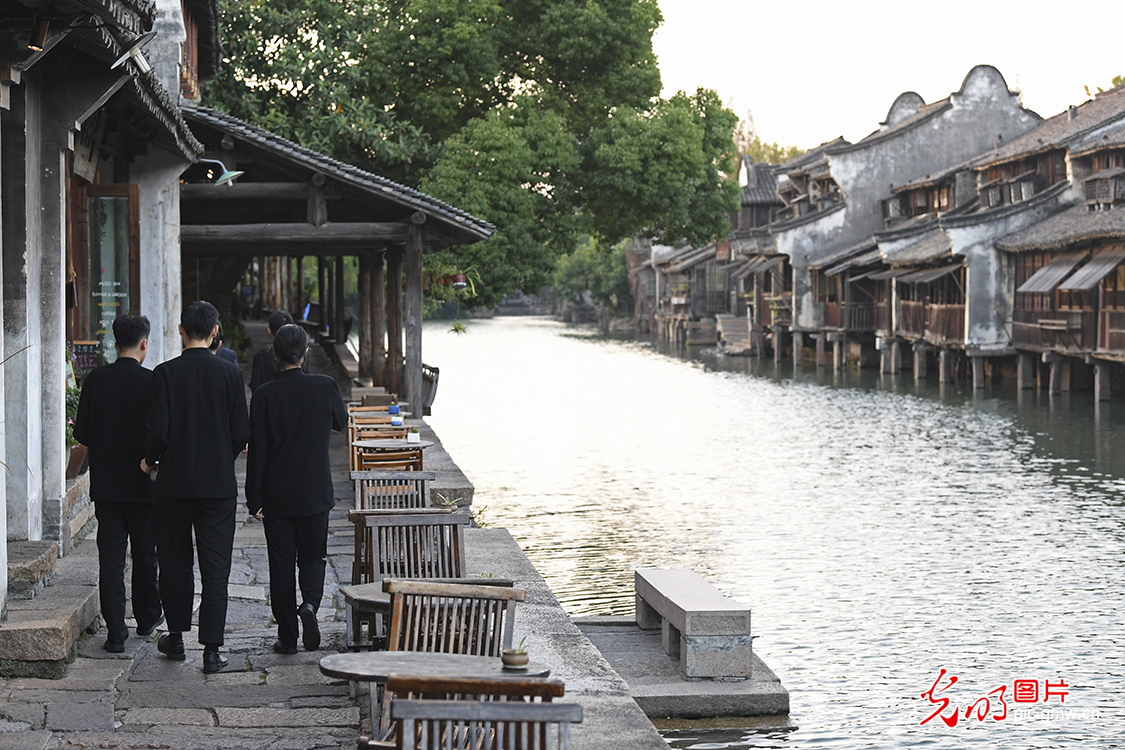 2022年11月6日,几名工作人员走在乌镇西栅景区。(光明网记者 潘迪摄/光明图片)