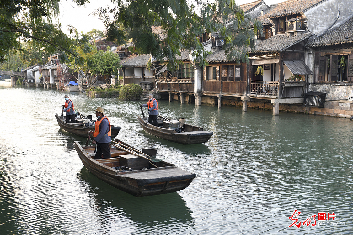 2022年11月6日,乌镇西栅景区,三名工作人员驾船从水上经过。(光明网记者 潘迪摄/光明图片)