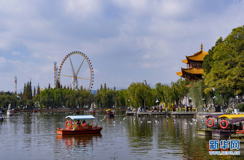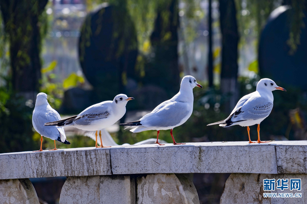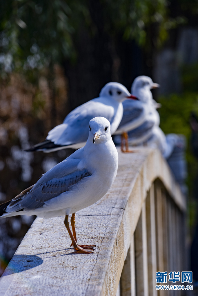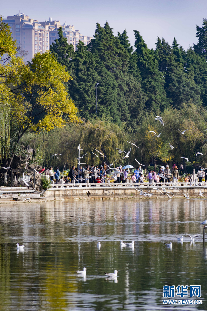 近日,从北方远道而来的红嘴鸥先头部队陆续抵达云南昆明。在昆明市大观公园内,红嘴鸥吸引了不少市民游客前来观赏,构成了一幅人鸥同乐的和谐画卷。新华网发(郑益 摄)