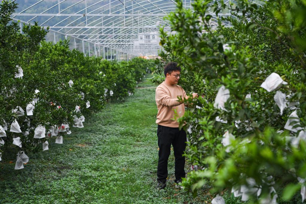 初冬时节,重庆大足区中敖镇加福村的上千亩柑橘林挂满果实。“园长”刘峰钻正忙着查看晚熟柑橘的生长情况。硕士毕业后,刘峰钻曾作为一名工程师参与水电站建设。出于对农业的兴趣,2017年他辞掉工作,和合伙人到这里流转1010亩土地,建起柑橘园。