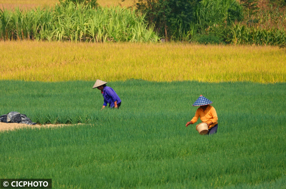 ↑2022年11月7日,广西南宁市西乡塘区石埠街道和安村,农民在田间管护香葱。CICPHOTO/喻湘泉 摄