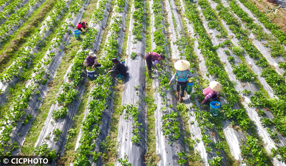 ↑2022年11月7日,广西贺州市八步区莲塘镇,农民在田间管护草莓苗。(无人机照片)CICPHOTO/廖祖平 摄