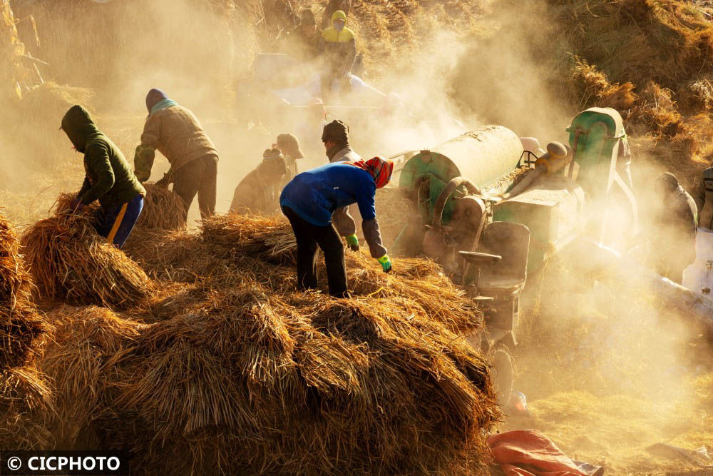 ↑2022年11月5日,吉林省磐石市大泉眼村,农民在稻谷场打稻谷。CICPHOTO/徐东林 摄