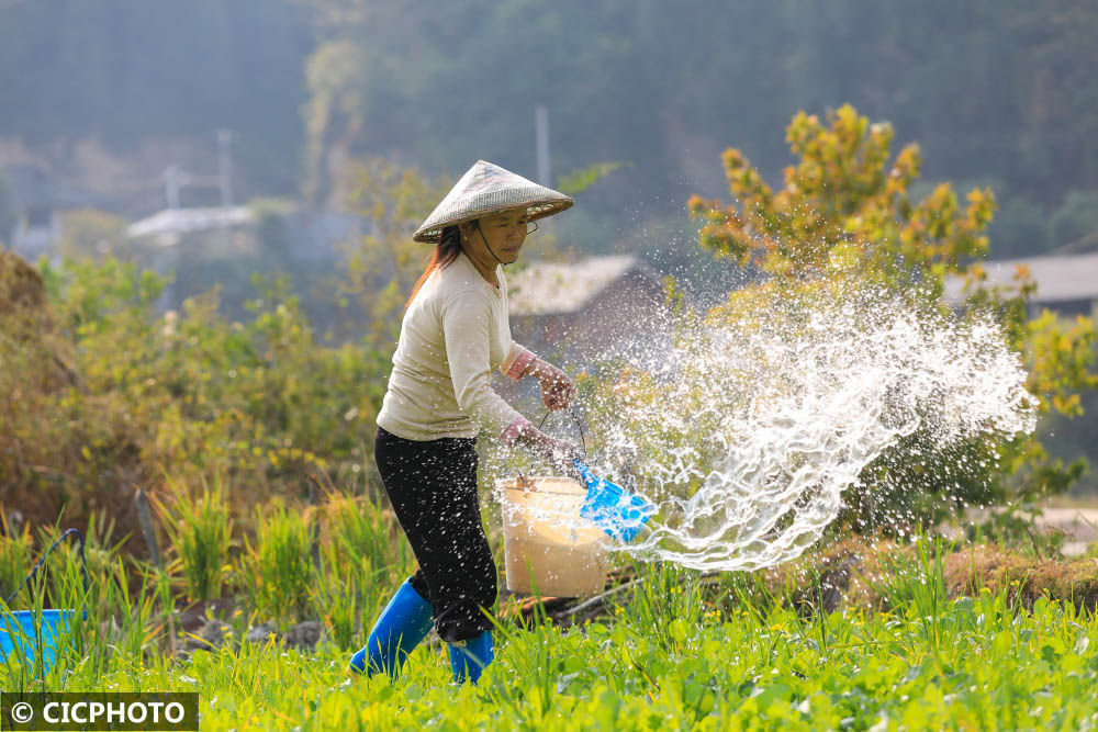 ↑2022年11月5日,贵州省从江县刚边壮族乡三联村,农民在田间给蔬菜浇水。CICPHOTO/罗京来 摄