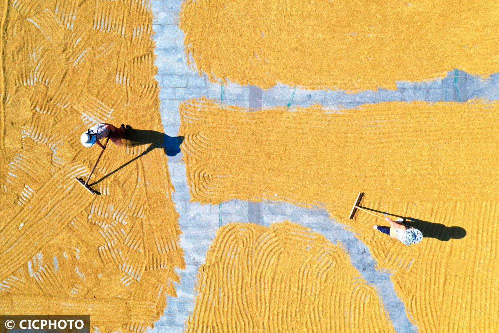 ↑2022年11月2日,广西南宁市宾阳县古辣镇蔡村,农民在晾晒稻谷。(无人机照片)CICPHOTO/喻湘泉 摄