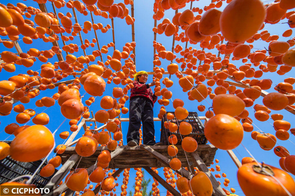 ↑2022年11月2日,山东省临朐县五井镇隐士村,农民在吊挂晾晒柿子。CICPHOTO/陈明 摄