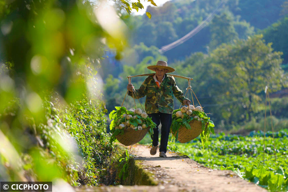 ↑2022年11月2日,重庆市北碚区龙凤桥街道凤凰村,农民在担运刚采收的萝卜。CICPHOTO/秦廷富 摄