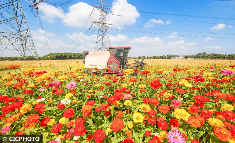 ↑2022年11月1日,浙江省湖州市德清县新市镇谷门村,农民在驾驶收割机收割水稻。CICPHOTO/王树成 摄