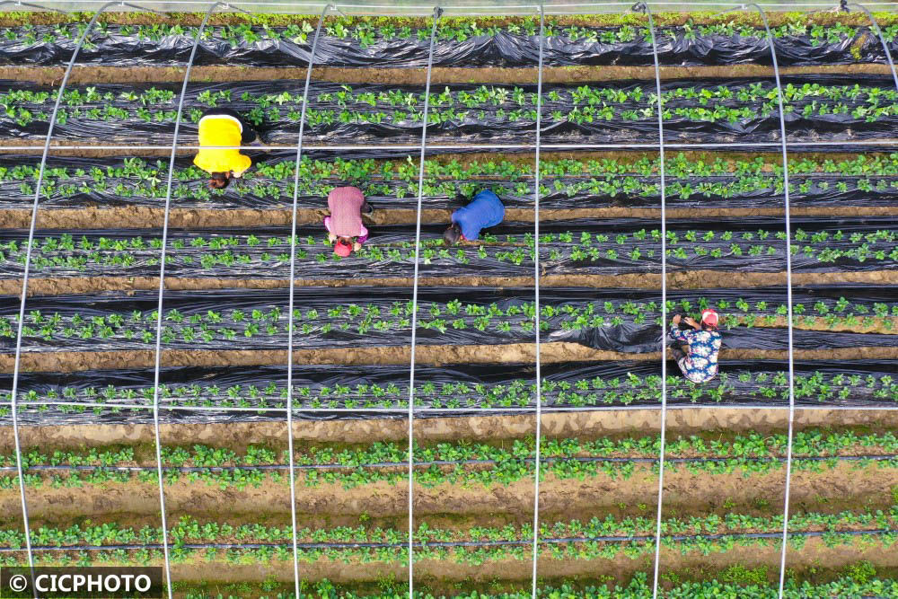 ↑2022年10月31日,湖南省湘西土家族苗族自治州吉首市石家冲街道寨阳村,农民在管护草莓苗。(无人机照片)CICPHOTO/刘振军 摄