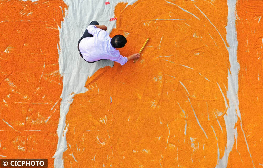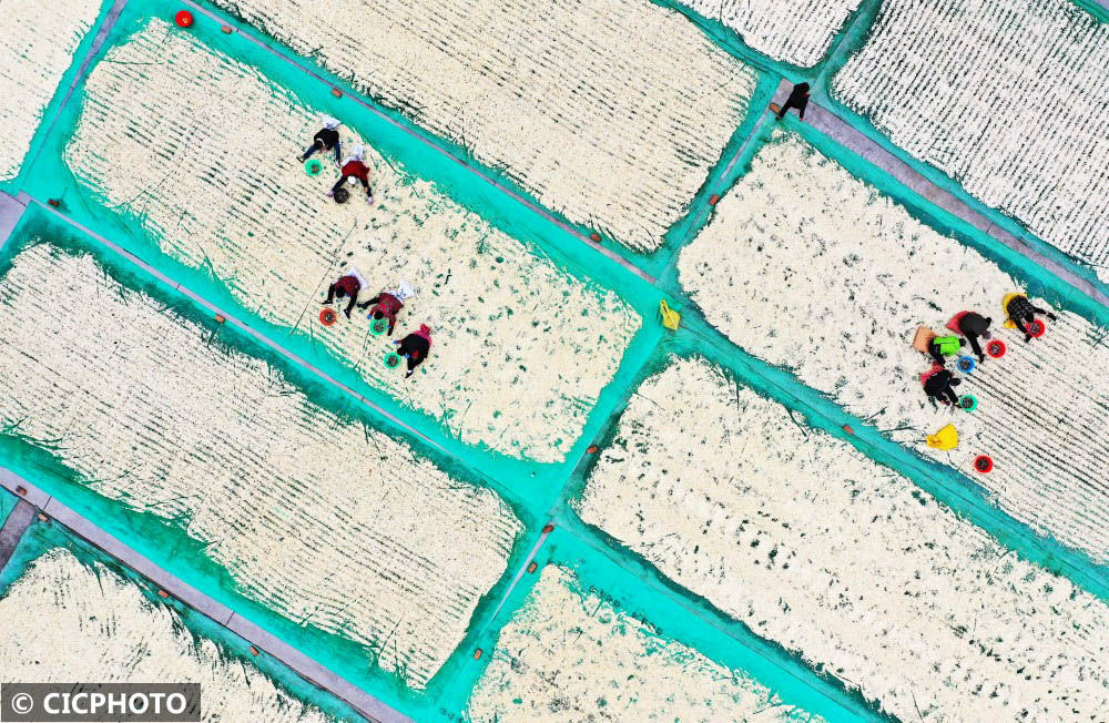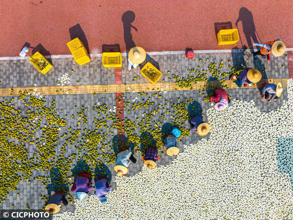 ↑2022年10月29日,山西省运城市新绛县泽掌镇王金村,农民在挑拣晾晒的中药材旱半夏。(无人机照片)CICPHOTO/高新生 摄