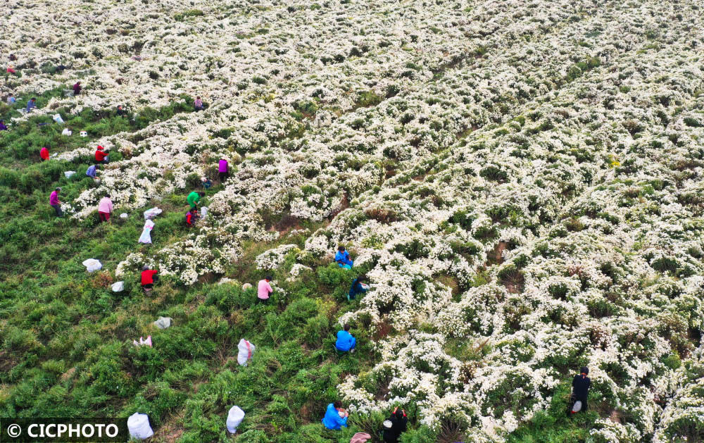 ↑2022年10月30日,安徽省亳州市谯城区十八里镇菊花种植基地,农民在采摘贡菊。(无人机照片)CICPHOTO/张延林 摄