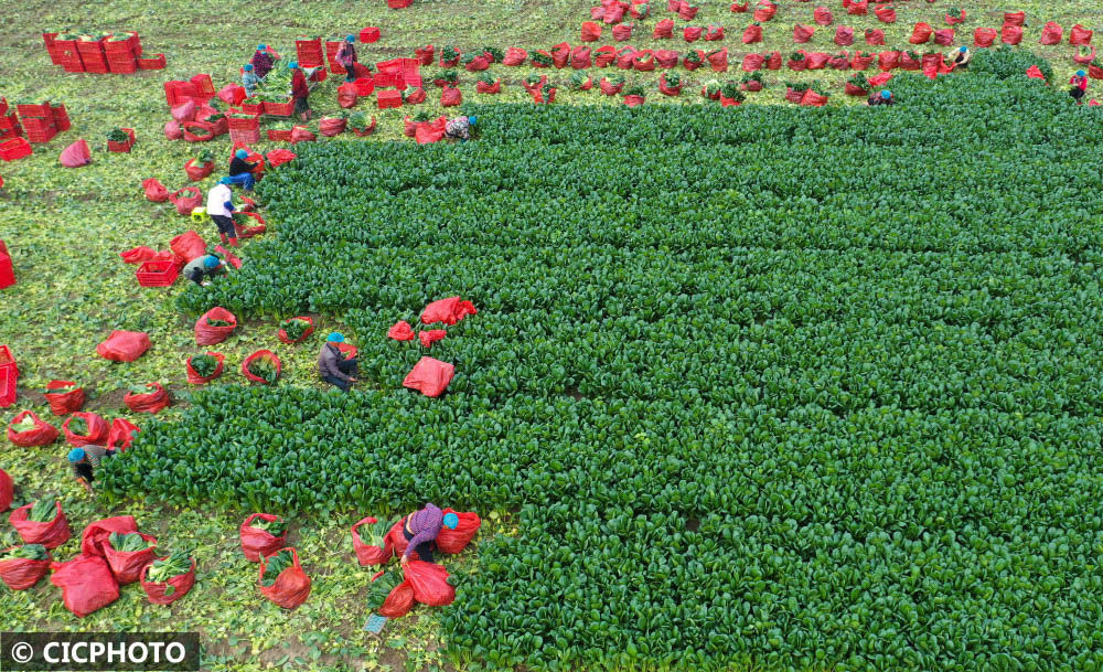 ↑2022年10月28日,安徽省蒙城县小辛集乡李大塘村,农民在采收青梗菜。(无人机照片)CICPHOTO/胡卫国 摄