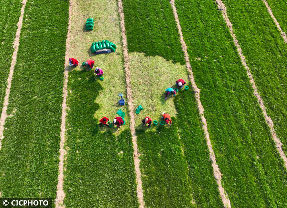 ↑2022年10月28日,山东省聊城市东昌府区闫寺街道李找村,农民在收获面条菜。(无人机照片)CICPHOTO/张振祥 摄