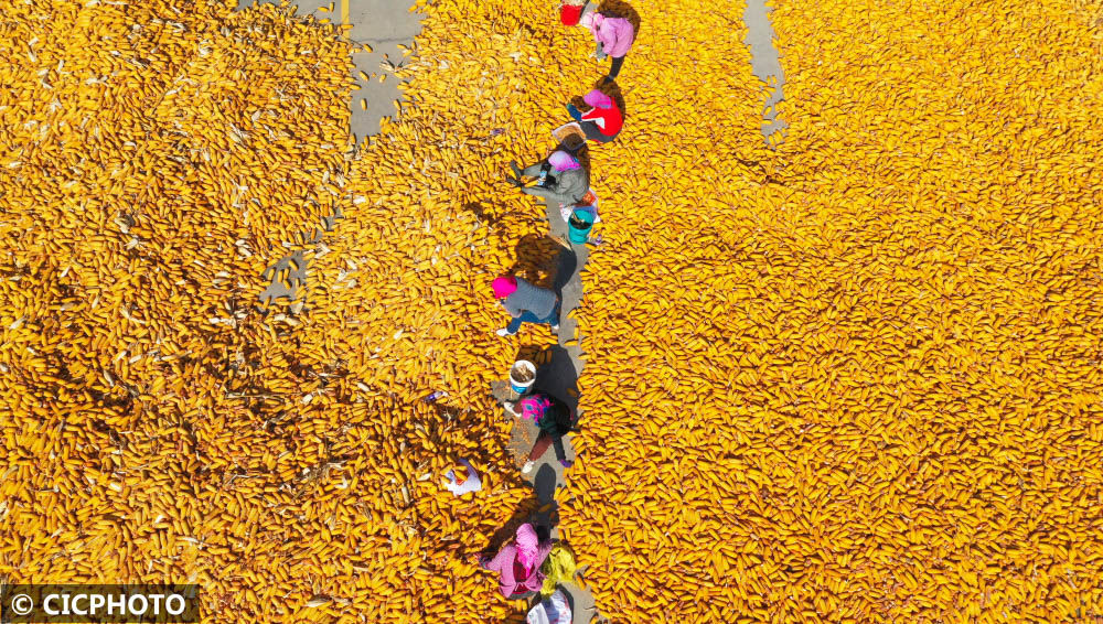 ↑2022年10月27日,辽宁省大连市普兰店区沙包街道奎兴社区,农民在优选丰收的玉米。(无人机照片)CICPHOTO/吕文正 摄