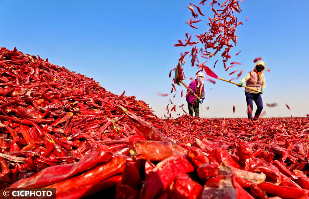 ↑2022年10月26日,甘肃省张掖市甘州区乌江镇敬业村,农民在晾晒红辣椒。CICPHOTO/王将 摄