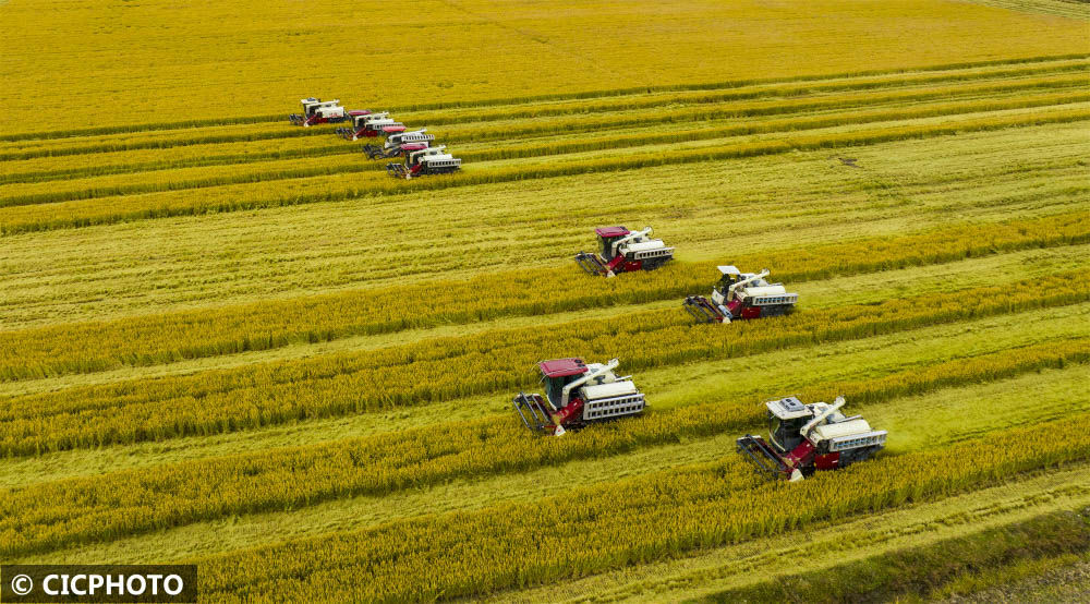 ↑2022年10月26日,江苏省连云港市东海县平明镇,农民在驾驶收割机收割水稻。(无人机照片)CICPHOTO/柴军委 摄