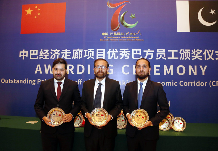 2021年12月29日,优秀员工代表在巴基斯坦伊斯兰堡举行的中巴经济走廊项目优秀巴基斯坦员工颁奖仪式上合影。