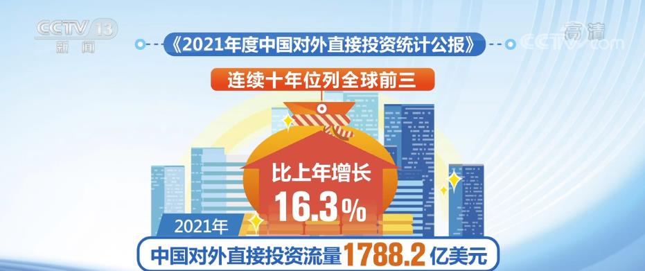 《公报》显示,2021年,中国对外直接投资流量1788.2亿美元,比上年增长16.3%,连续十年位列全球前三。2021年末,中国对外直接投资存量2.79万亿美元,连续五年排名全球前三。