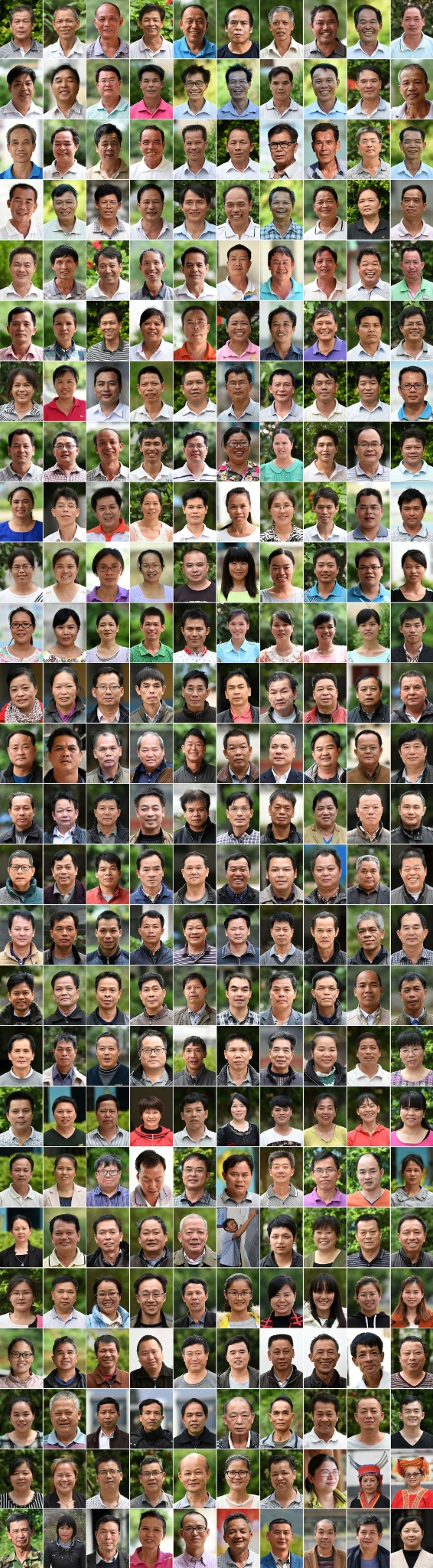 ↑ 这张拼版照片是2012年至2022年拍摄的260名山区教师的肖像,他们是广西天等县、大新县、全州县、灌阳县、灵川县、昭平县、上思县、都安瑶族自治县、大化瑶族自治县、龙胜各族自治县、三江侗族自治县、融水苗族自治县、富川瑶族自治县、金秀瑶族自治县部分山区老师,绝大部分是教学点老师。