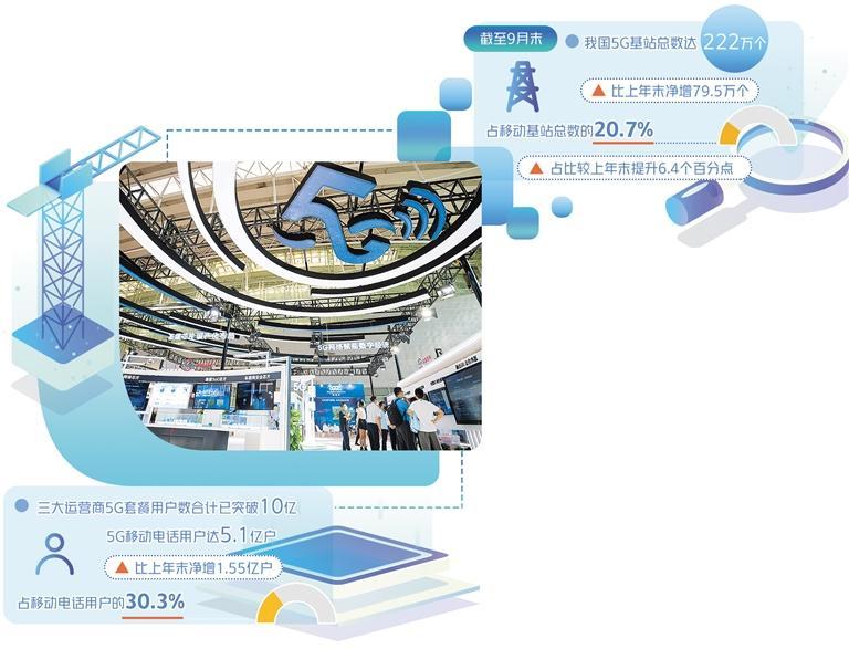 5G商用已满3年。工业和信息化部日前公布的数据显示,截至9月末,我国5G基站总数达222万个,比上年末净增79.5万个,占移动基站总数的20.7%,占比较上年末提升6.4个百分点。同时,我国三大运营商5G套餐用户数合计已突破10亿;5G移动电话用户达5.1亿户,比上年末净增1.55亿户,占移动电话用户的30.3%。