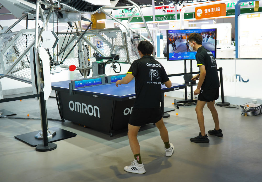 挖掘机可以借助5G技术实现远程操控、工业机器人机械手臂灵活高效。在欧姆龙展位,记者看到,一名“机器人球手”与两名真人选手激战正酣,“机器人球手”灵活运用球拍接打来球,尽管“一打二”,但丝毫不落下风。