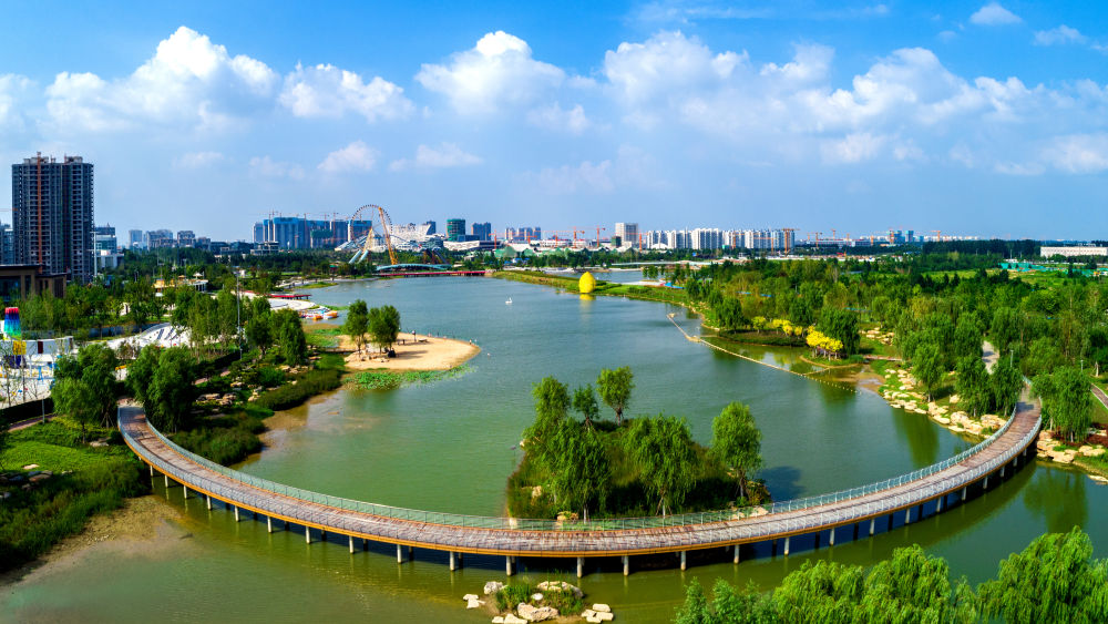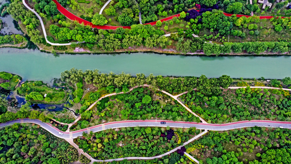 ↑市民在山东省济宁市十里湖湿地公园骑行。