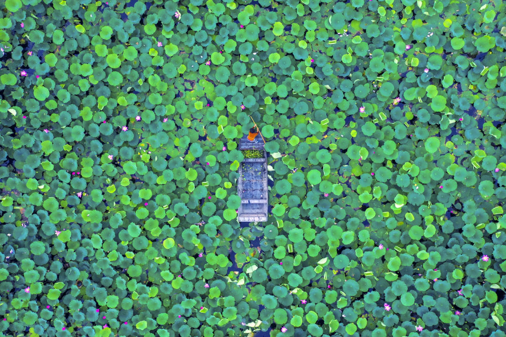 ↑渔民在山东省济宁市微山湖湿地采荷。