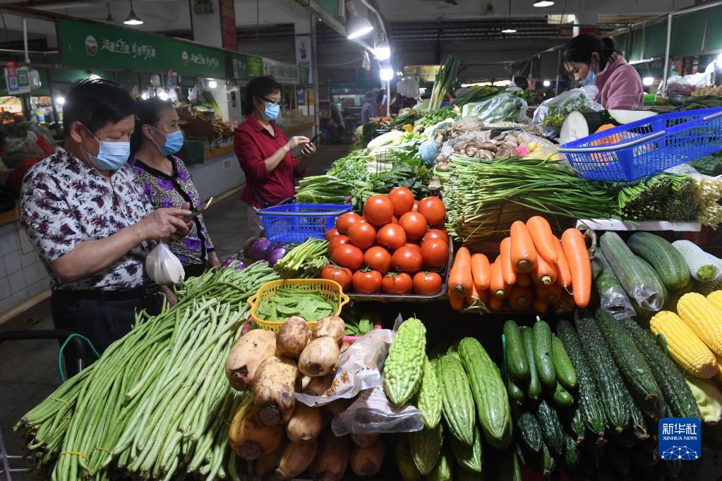 11月9日,在广西南宁市滨湖路一家农贸市场,市民在选购蔬菜。国家统计局9日发布数据,10月份,全国居民消费价格指数(CPI)同比上涨2.1%,涨幅比上月回落0.7个百分点;环比上涨0.1%,涨幅比上月回落0.2个百分点。新华社记者陆波岸摄