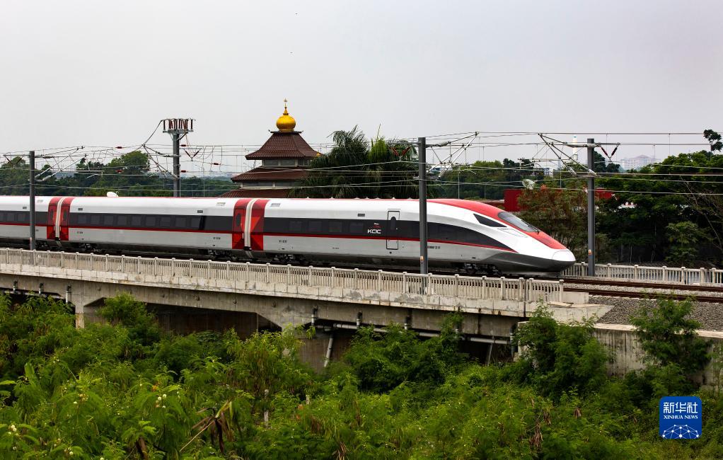 11月9日,在印度尼西亚西爪哇省万隆市,一列高铁动车组正在雅万高铁试验段进行热滑试验。新华社发(焦宏涛摄)