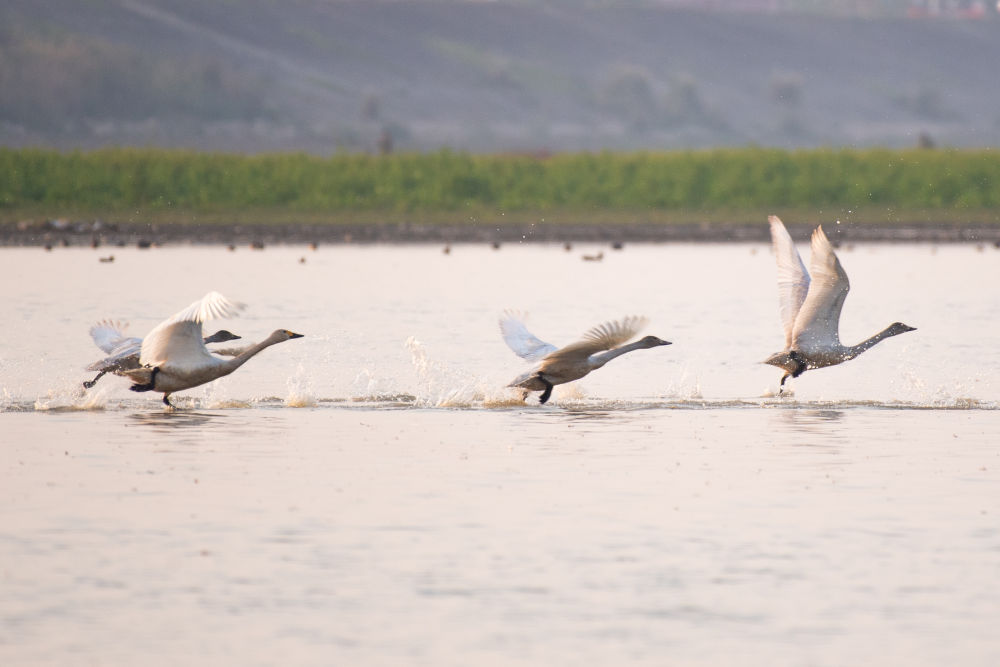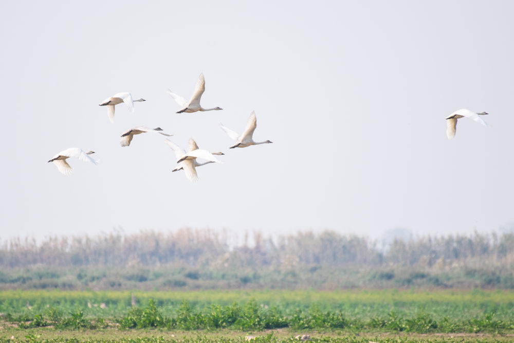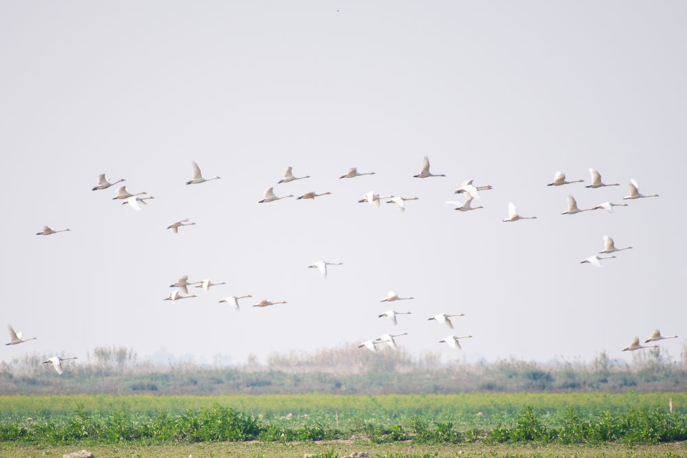 ↑11月10日,小天鹅在湖南西洞庭湖湿地上空飞翔。