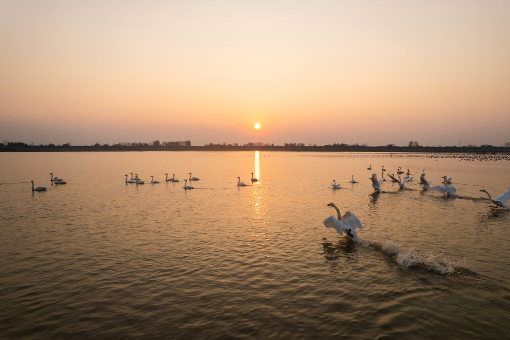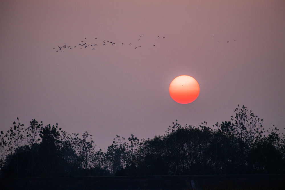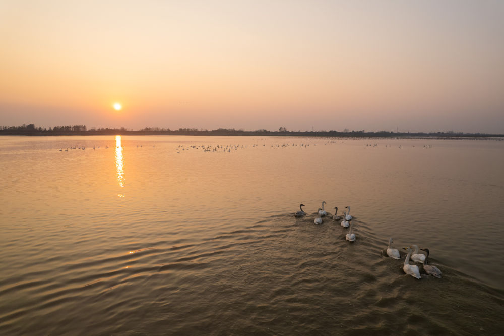 ↑这是11月10日在湖南西洞庭湖湿地拍摄的夕阳和候鸟。