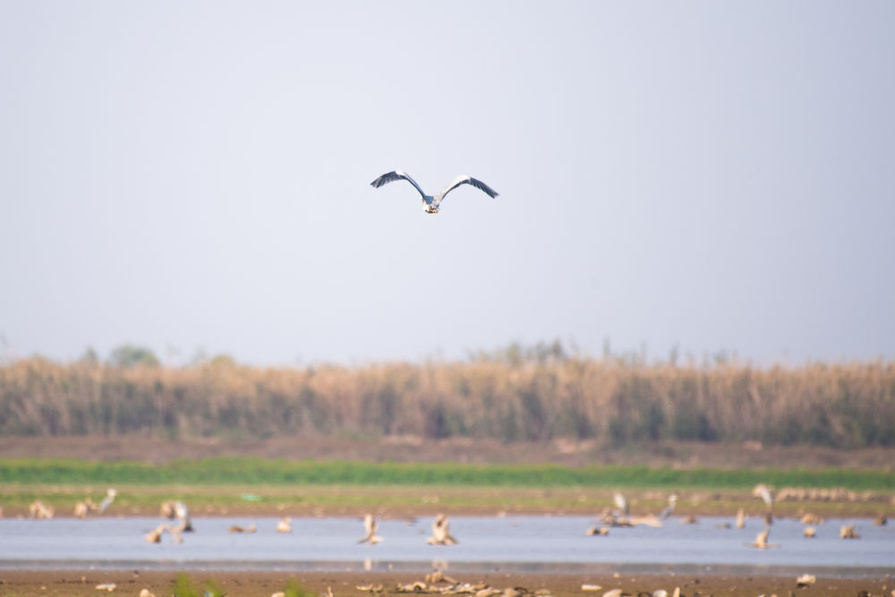 ↑11月10日,一只苍鹭在湖南西洞庭湖湿地上空飞翔。