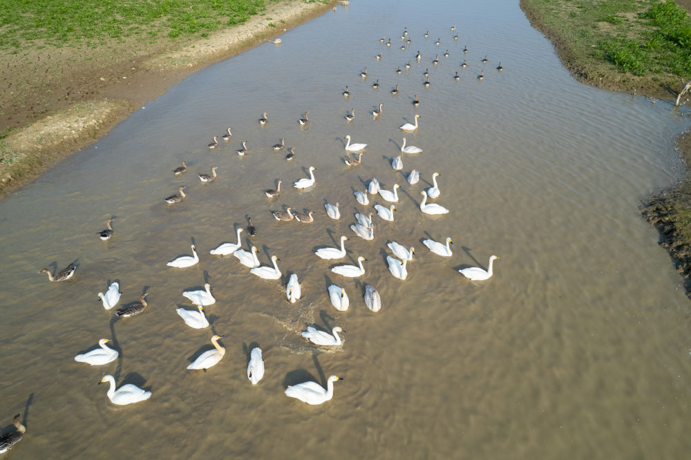 ↑这是11月10日在湖南西洞庭湖湿地拍摄的小天鹅和灰雁(无人机照片)。
