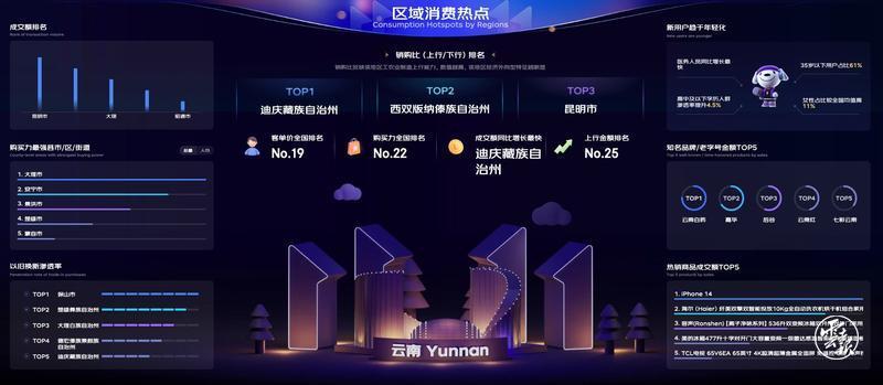 从商品来看,云南热销商品成交额TOP5为iPhone 14、海尔( Haier )纤美双擎双智能投放10Kg全自动洗衣机烘干机组合、容声( Ronshen )【离子净味系列】536升双变频冰箱、美的冰箱477升、TCL 电视65V6EA 65英寸4K超清免遥控电视。