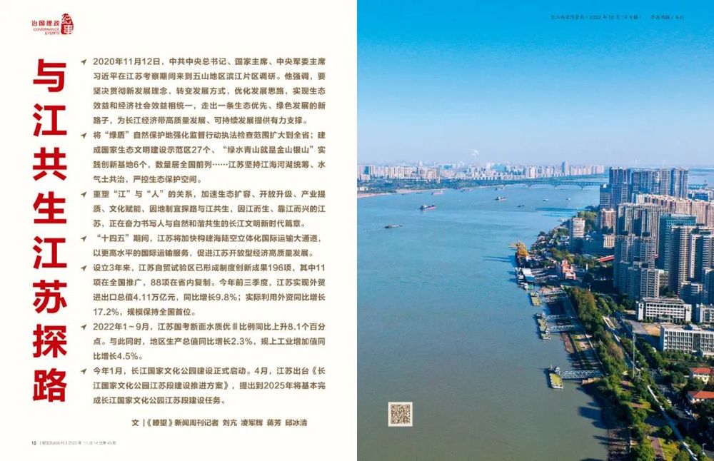 重塑“江”与“人”的关系,加速生态扩容、开放升级、产业提质、文化赋能,因地制宜探路与江共生,因江而生、靠江而兴的江苏,正在奋力书写人与自然和谐共生的长江文明新时代篇章。