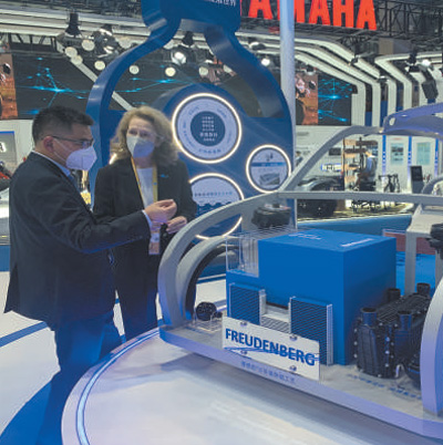 11月6日,在首次参展的德国科德宝集团展位上,工作人员向参观者介绍展品性能和技术。