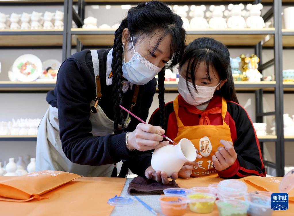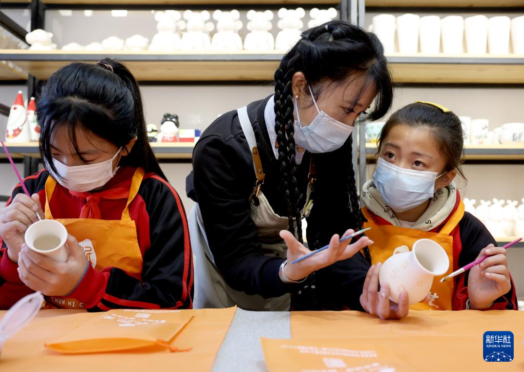 11月11日,江苏省徐州市汉王镇紫山村春泥陶艺的老师(左)在陶艺教室向学生讲解彩陶绘陶的有关知识。