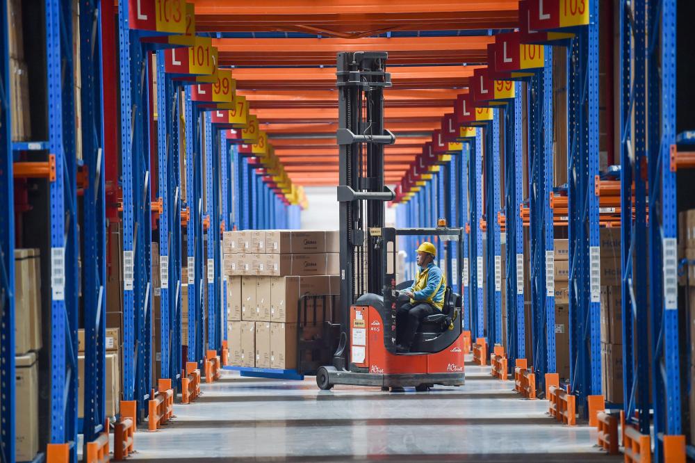 在位于江苏省南京市江宁区的苏宁华东物流中心,工人驾驶叉车搬运商品(2022年11月10日摄)。新华社发(方东旭 摄)