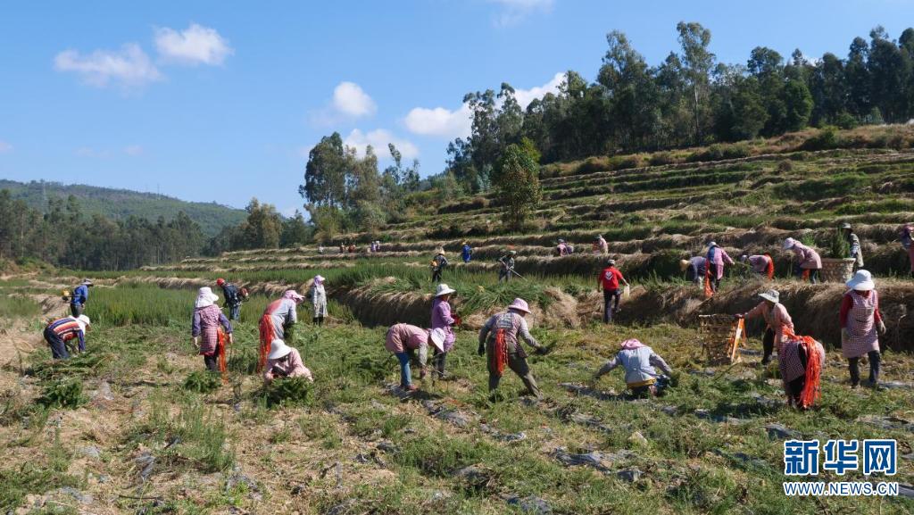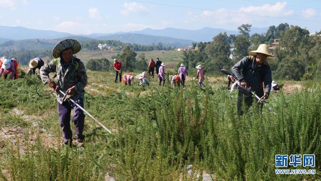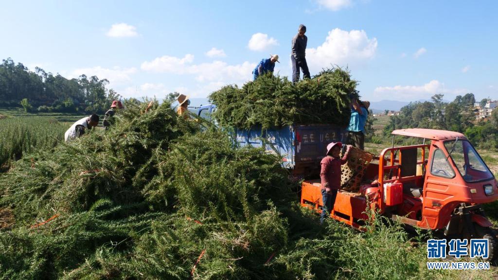 入冬时节,在云南省楚雄彝族自治州牟定县,数千亩迷迭香进入采收期,在田间采收迷迭香的村民将一株株碧绿的迷迭香收割、绑扎、装车,一派繁忙景象。