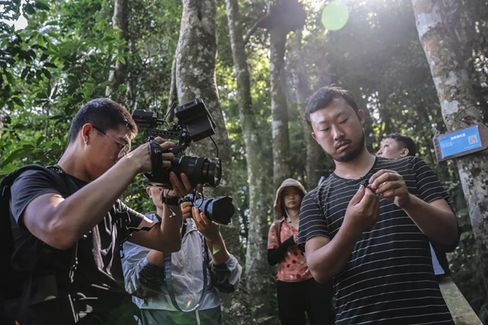 2022年6月29日,张辰亮(左4)在海南昌江霸王岭拍摄科普视频。新华社记者 张丽芸 摄