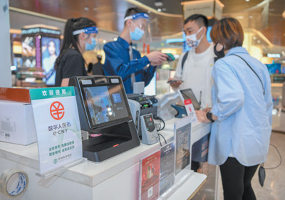 2022年5月3日,顾客正在海南省海口市的免税商场内使用数字人民币进行结算。苏弼坤摄(人民视觉)