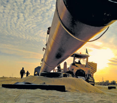 位于沙特哈拉德—哈维亚天然气田区域的沙特哈拉德及哈维亚北部压气站管道项目施工现场。中国石油管道局工程有限公司供图