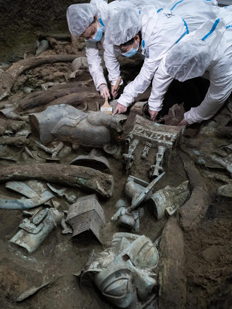 三星堆8号坑发掘人员在认真清理大型神兽与青铜神坛。北京大学考古文博学院供图