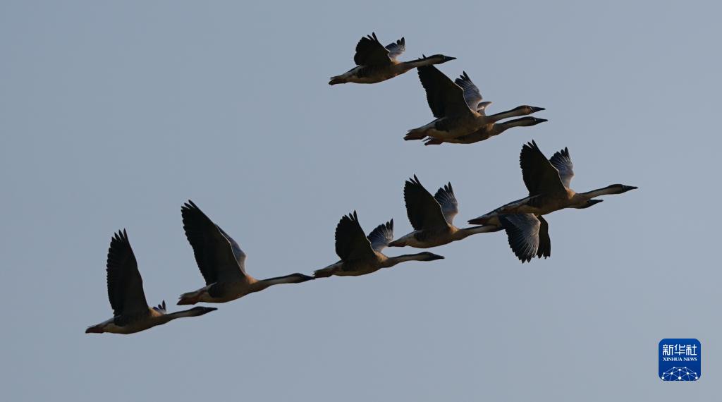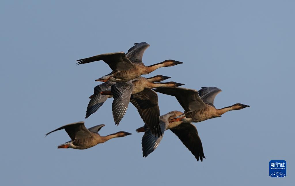 11月10日,鸿雁在南昌高新区五星白鹤保护小区飞翔。新华社记者周密/摄