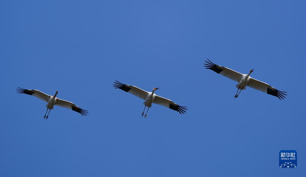11月10日,白鹤在南昌高新区五星白鹤保护小区飞翔。新华社记者周密/摄