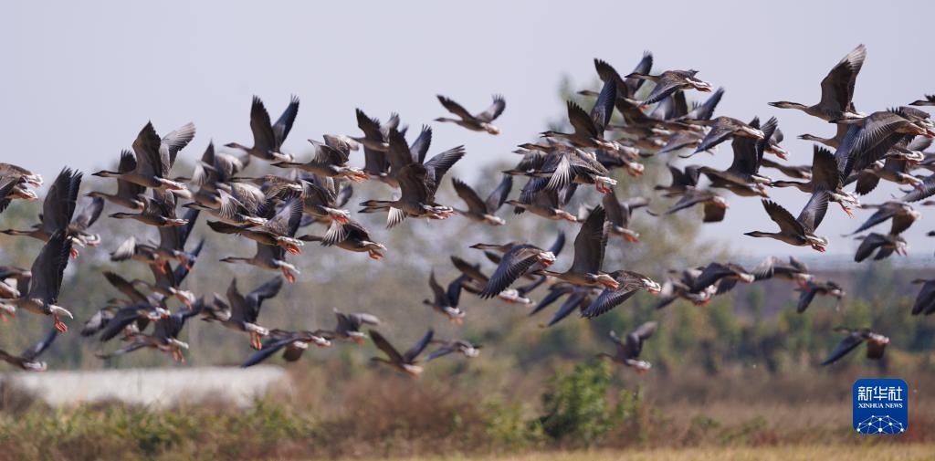 11月10日,大批鸿雁在南昌高新区五星白鹤保护小区飞翔。新华社记者周密/摄